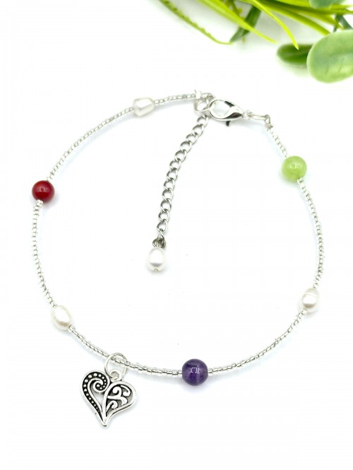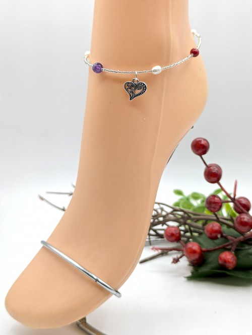 Браслет на ногу с жемчугом, кораллом, аметистом и ониксом