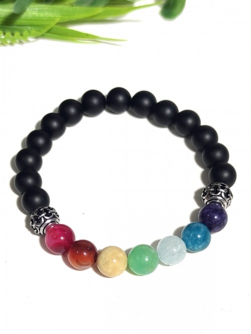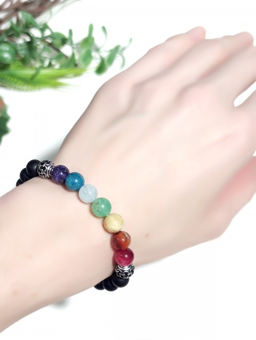 Браслет 7 Чакр: агат, сердолик (сардоникс), желтый берилл, хризопраз, аквамарин, апатит и чароит.