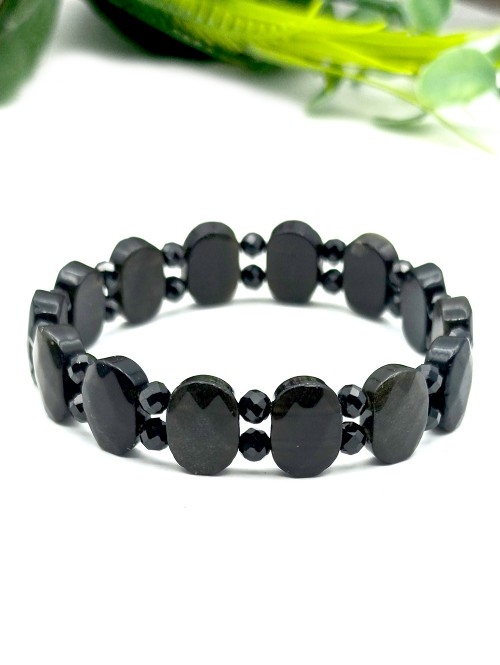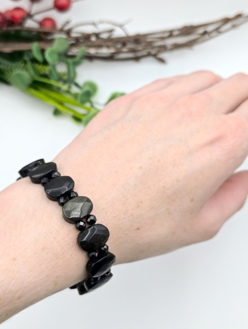 Браслет из серебристого и золотистого обсидиана и черной граненой шпинели.