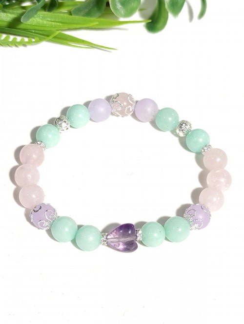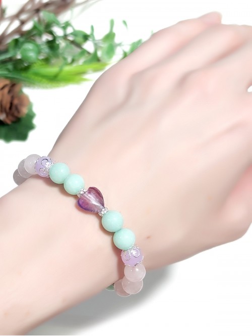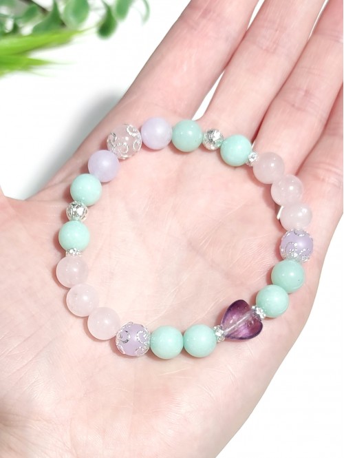 Браслет из флюорита (сердечко в центре), мятного, лавандового и розового кварца.