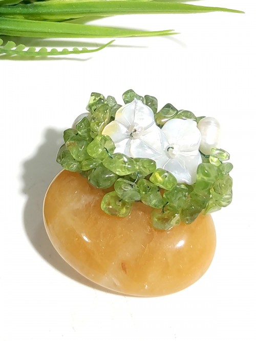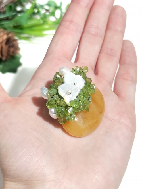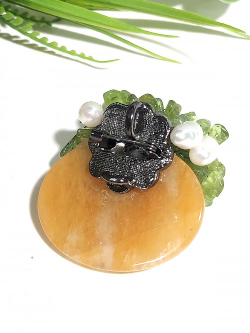 Брошь-подвеска с желтым халцедоном, хризолитом, жемчугом и перламутром