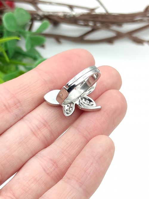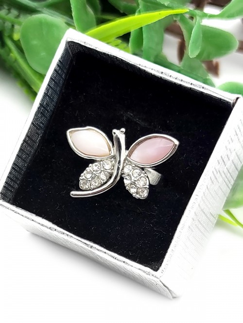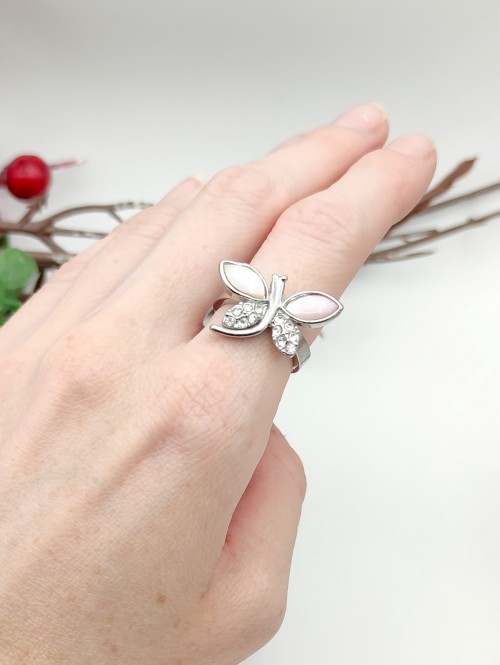Безразмерное сверкающее кольцо Стрекоза с розовым перламутром и фианитами. Родиевое покрытие.