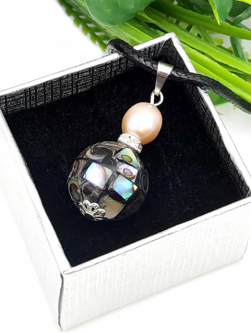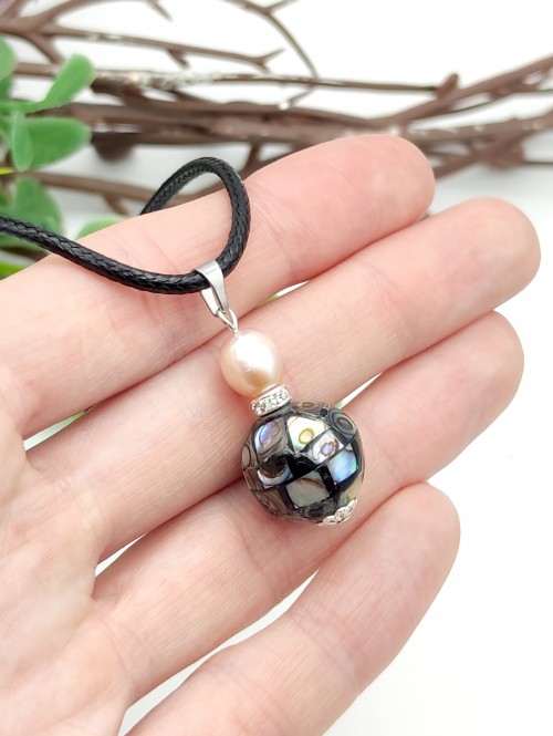 Подвеска из халиотиса (перламутра) и персикового речного жемчуга. Вставка с фианитами.