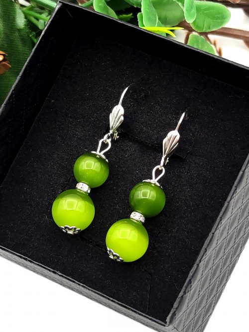 Серьги с зелёным кошачьим глазом и фианитами