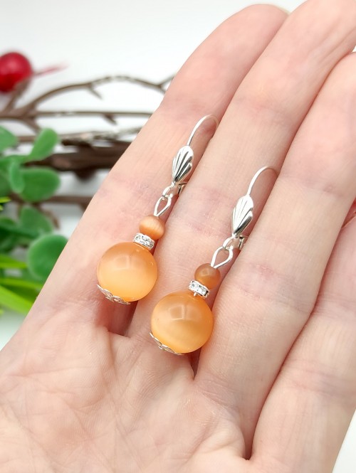 Серьги с оранжевым кошачьим глазом (синтетическим) и фианитами.